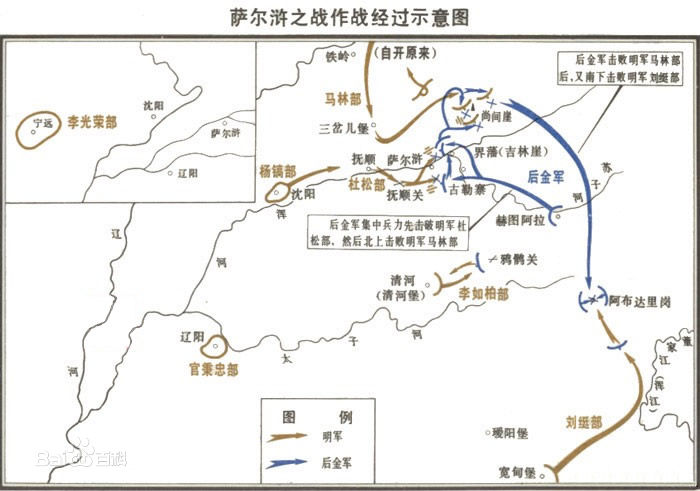 明军西路主帅杜松,出身于将门之家,兄长杜桐由末弁以军功升至大帅。杜松“勇健绝伦”,至总兵官,历镇延绥、蓟州、辽东、山海关,且秉性清高,不贪财,不怕死,不巴结上司,不笼络权贵,但性急“尚气”,刚愎自用,图功心切。努尔哈赤设下埋伏,诱其轻骑奔驰,进入伏中,即亲率八旗劲旅,以两倍兵力,勇猛冲杀,于三月初一日在萨尔浒(今辽宁抚顺市东大伙房水库所在地)迅速消灭了明军,斩杀杜松、王宣、赵梦麟三总兵,随即于第二日在尚间崖击败北路兵,主将马林总兵匆忙逃走。努尔哈赤又命大贝勒代善统军迎战明东路刘铤军。代善在距赫图阿拉五十里处的阿布达里岗“设伏于山谷”,遣明降官持所得杜松之“号矢”(令箭)驰至明营,诈称杜松已抵酋城,催军往援。刘铤虽系勇将虎子,所使镔铁大刀重一百二十斤,“马上轮转如风”,又久经征战,颇谙兵法,军功累累,升至总兵官,但因害怕杜松“独有其功”,使己“宿名顿坠”,遂听信其言,督军迅进,陷入伏中。代善挥军猛攻,斩杀刘铤,全歼明军,逼朝鲜兵一万三千人投降。明军南路因奉经略杨镐回师之檄,仓皇撤退。