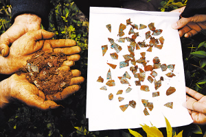 在白石崖村民陆菊珍和杨光华家,笔者看到了僰人独特的服饰。僰人男子穿麻布或棉布短衣裤,外套一件绣有花纹的无袖麻布褂子。女子头戴套头,形似鸡冠,僰人称其为“冲天帽”、“鸡冠帽”,帽周围整齐地排列着各种颜色的小彩珠和海贝,并配以银器、骨质饰物等。妇女衣服宽腰大袖,胸襟上绣有美丽的彩色花纹图案,肩挎红线球的背袋。