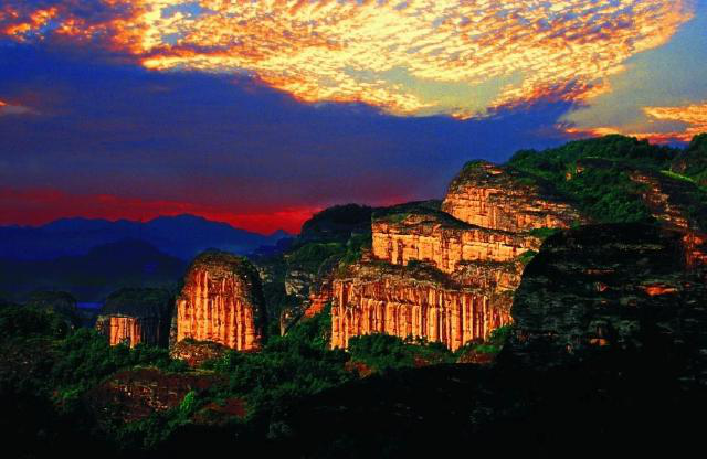 中国丹霞世界遗产地的特征是壮观的红色悬崖以及一系列侵蚀地貌,包括雄伟的天然岩柱、岩塔、沟壑、峡谷和瀑布等。这样跌宕起伏的地貌,对保护当地的亚热带常绿阔叶林和动植物物起到了重要作用,其中包括约400种稀有或受威胁物种。