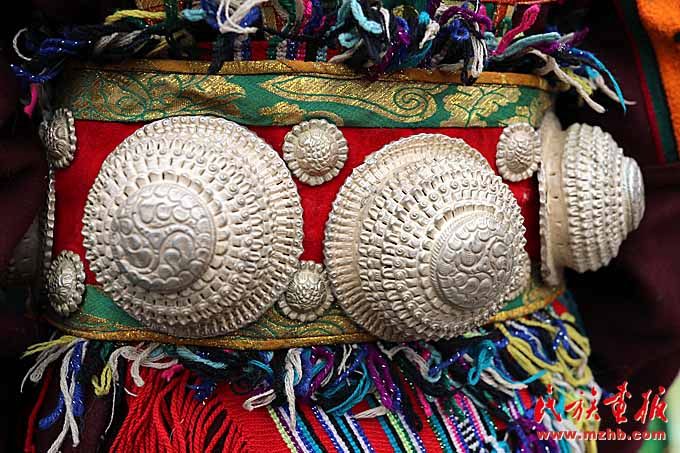 藏族女子胸前的金银饰品以及玛瑙珊瑚等。