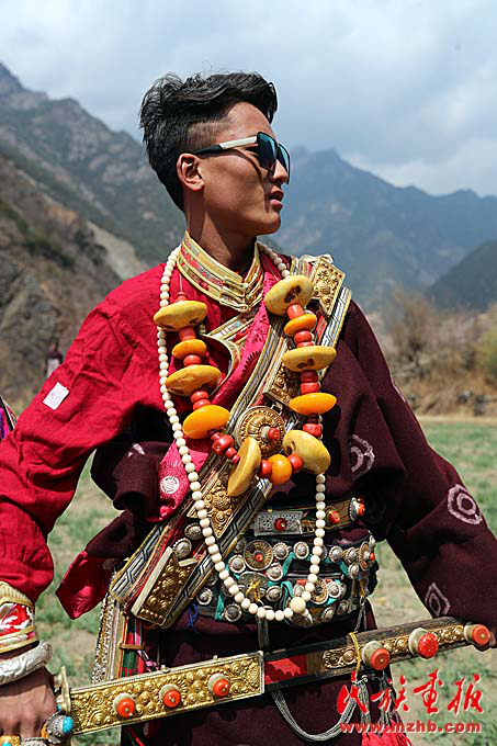 藏族妇女身穿用麻布、呢绒和毛料等厚重的面料缝制的连衣裙,衣领、大襟都顺边镶金线布或红、黄、蓝色布条,腰束毛布(或氆氇)宽带,再束配有各种银饰品的皮带,连衣裙下摆齐脚胫。颈项上戴着象牙环、珊瑚、蜜蜡、金银等制作的佩饰,头上编织的“桑股”头饰阳光下熠熠生辉,光彩夺目。男子要内穿呢绒或白色棉布偏襟短衣,领口和衣襟都镶着金边,外套藏袍。藏袍宽肥,袖子长大,佩戴耳环、项链、胸饰(呷哟)、腰饰、戒指等各种豪华佩饰,显得威武雄壮。