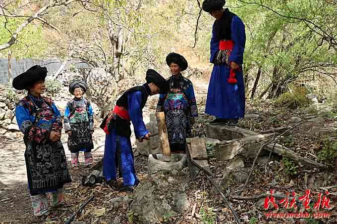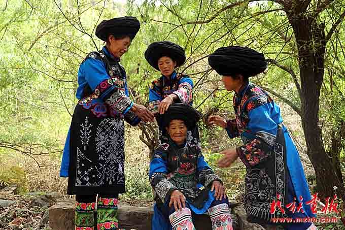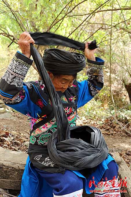 木里县项脚蒙古族乡项脚村,73岁的龚兴兰身穿明清风格汉族服饰,同伴们帮她缠黑布头帕。
