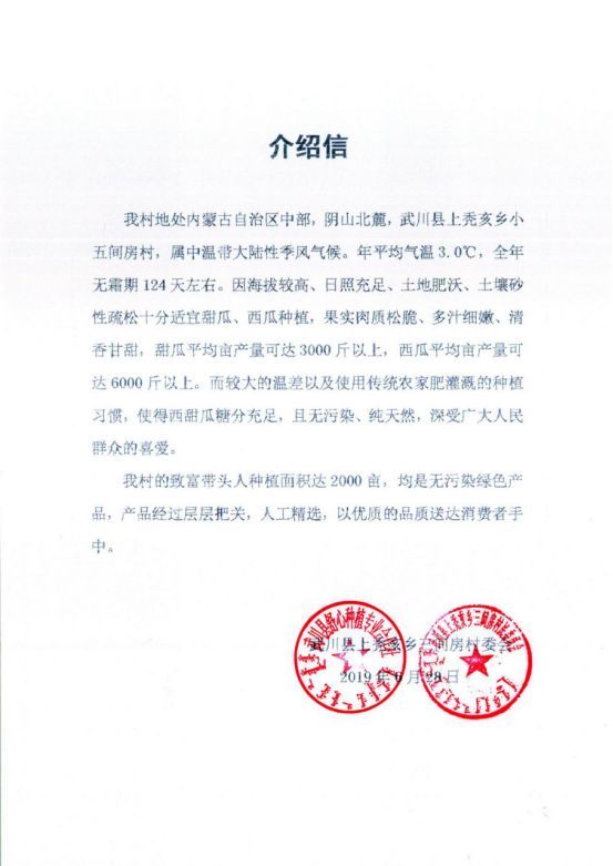 武川县位于内蒙古自治区中部,阴山北麓,总面积4885平方公里。全境在北纬40°47′-41°23′、东经110°31′-111°53′之间。属中温带大陆性季风气候。年平均气温3.0℃,全年无霜期124天左右。该地相对较高的海拔、广阔的土地面积、疏松的砂性土壤十分适宜甜瓜种植,平均亩产量可达3000斤以上。而较大的温差以及使用传统农家肥灌溉的种植习惯,使得甜瓜糖分充足,且无污染、纯天然。